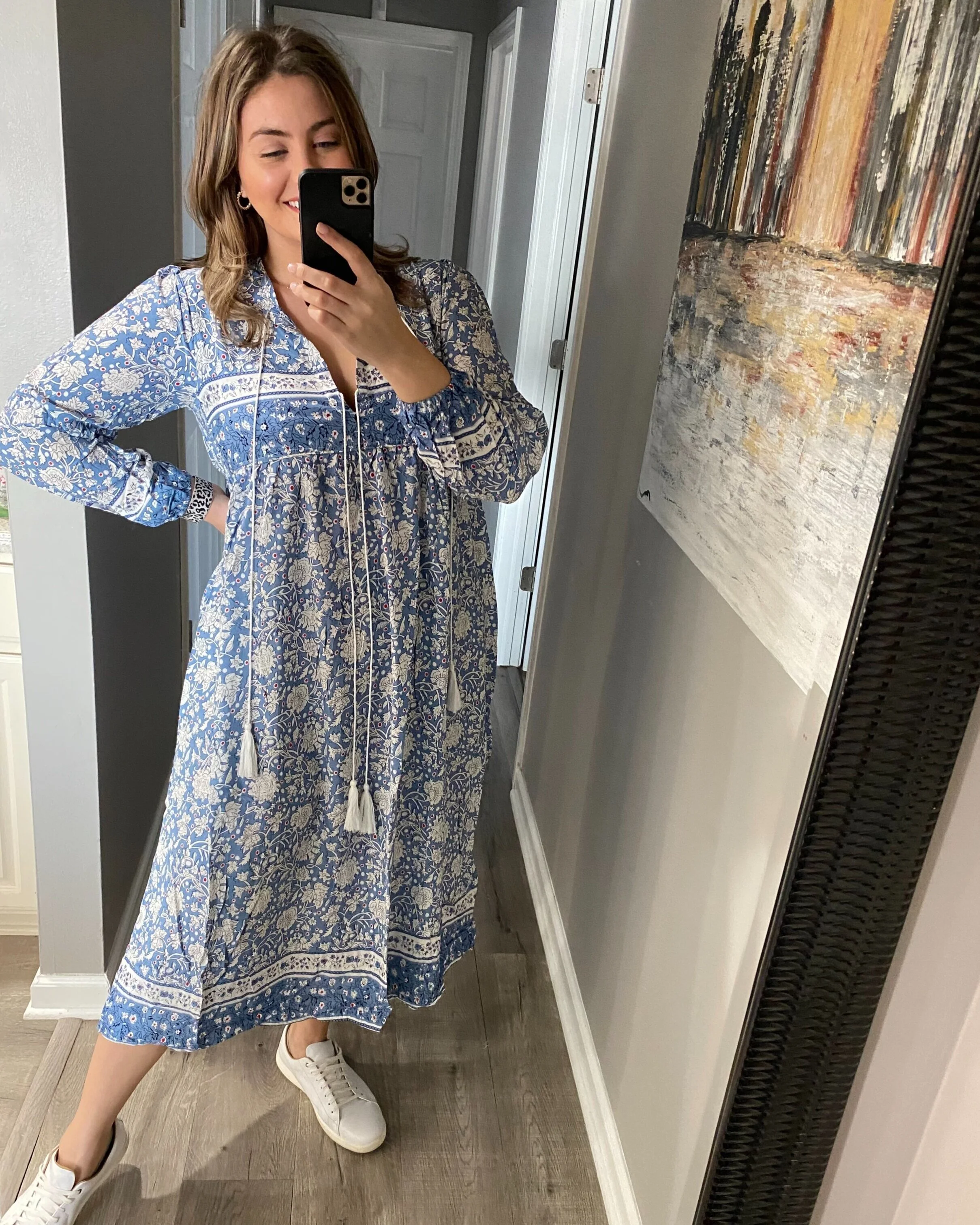 I just got this in the mail the other day in an XL and couldn’t be more impressed! It will be a great transitional piece throughout the spring into summer. I love it paired with my favorite white sneakers. For more spring dress inspiration and what I wear underneath them, be sure to check out this post!