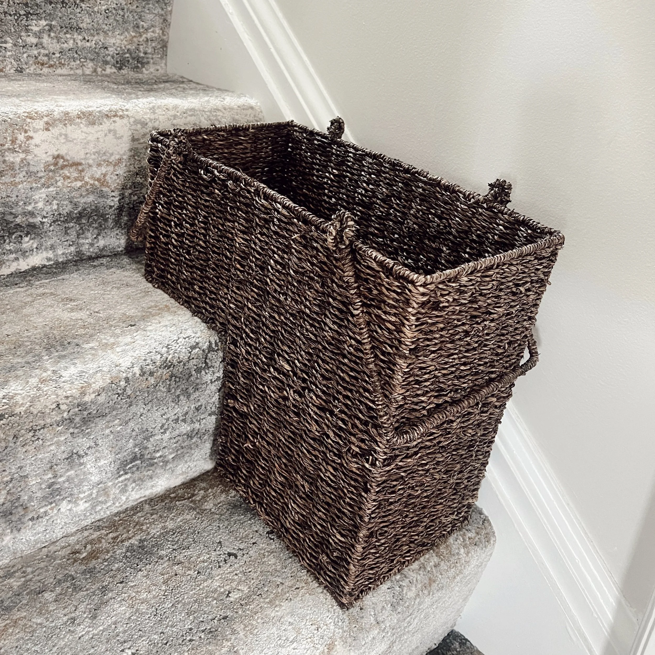 Raise your hand if you have endless piles of stuff constantly going up and down your stairs? It me. Well, I found this basket that fits perfectly on your stairs and has two sturdy handles to make for easy carrying.