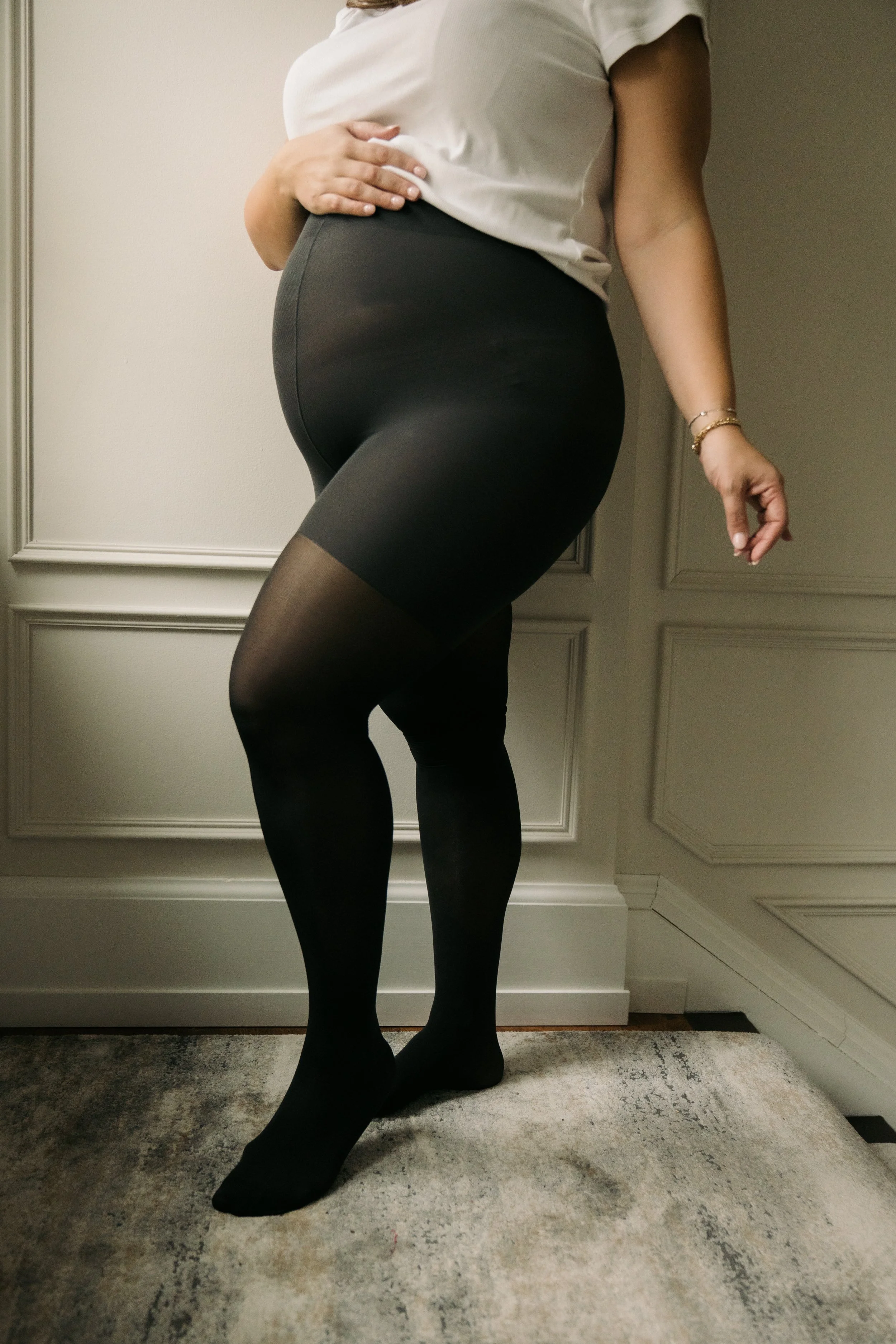 Memoi Maternity Tights: Designed with a soft belly panel and light leg compression, these are great for more dressed-up looks, think workwear, events, or anytime you want that smooth, put-together finish without sacrificing comfort.