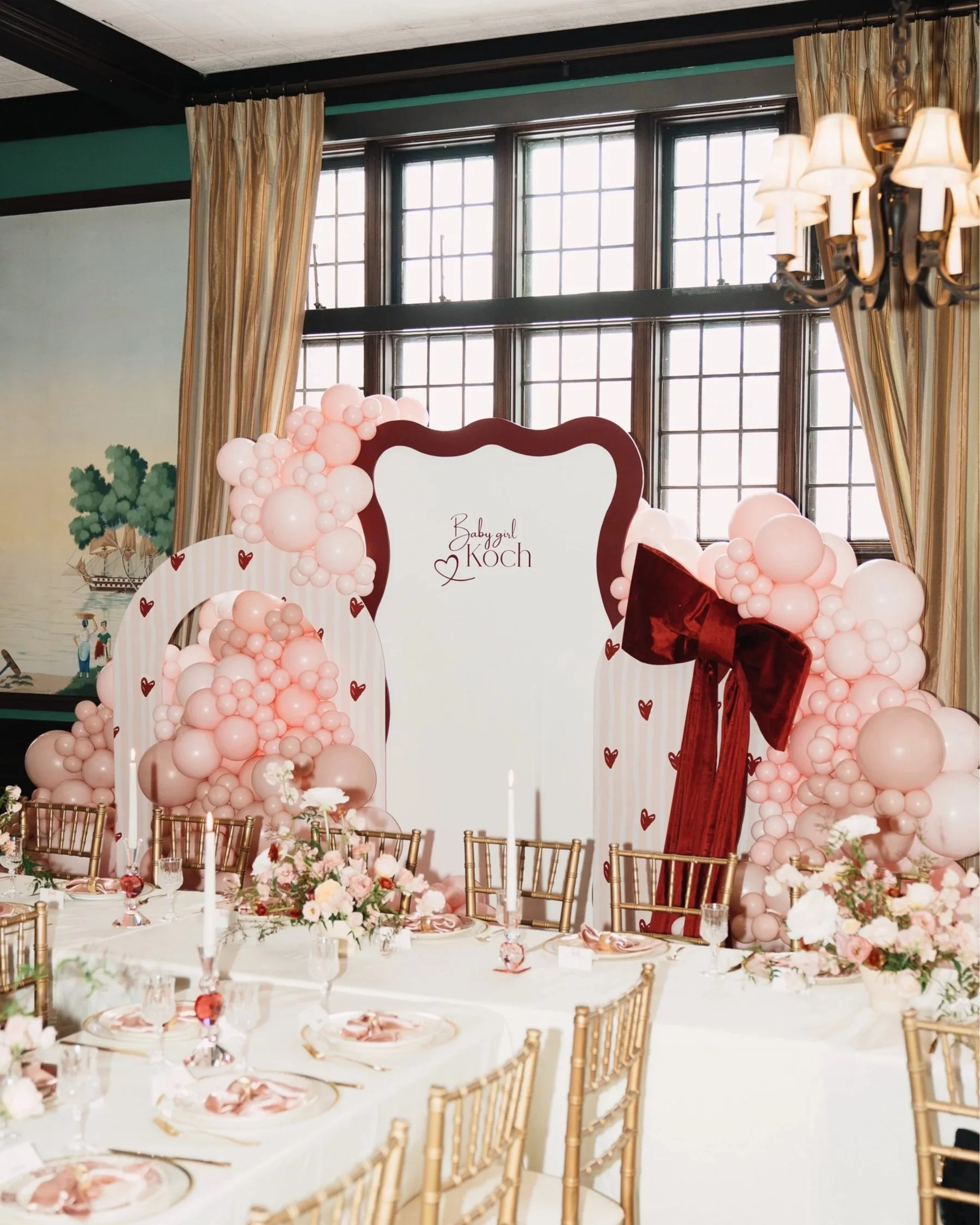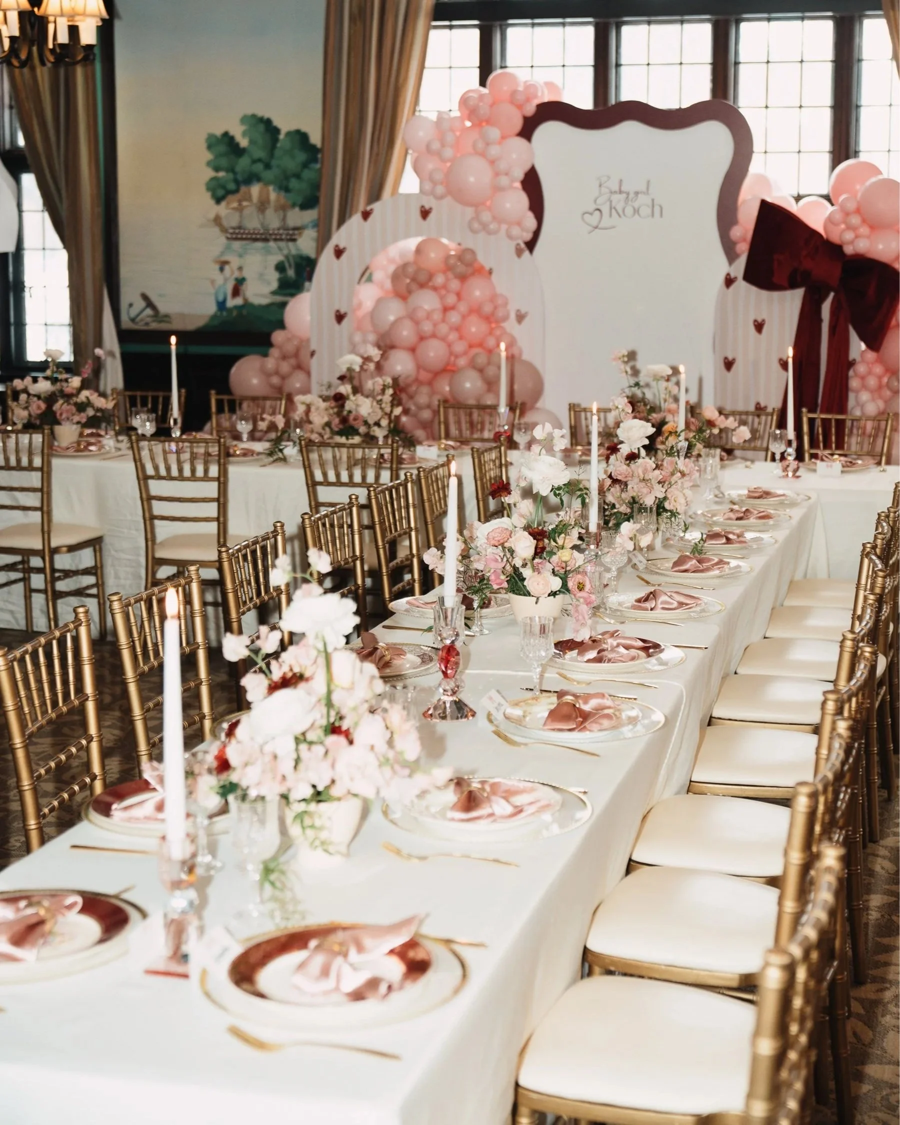 Due to scheduling conflicts, the only date that really worked ended up being Valentine’s Day, so we decided to fully lean into the theme and turn it into a Valentine’s / Galentine’s celebration centered around love, friendship, and (of course) a little girl power. The main focal point of the room, courtesy of Little Finch Co., was the balloon/backdrop. I was set on having one long table for everyone, even if that meant we had to get a little creative with a T-shape configuration to make it work in the space.